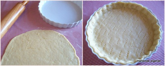 Tart kalıbı yağlanır. (küçük borcam tart kalıbı boyutunda herhangi bir kalıp olabilir. Benimki 28 cm çaplı bir kalıptı)Tart hamuru elle veya oklava ile tart kalıbı genişliğince açılarak kalıba yerleştirilir. Hiç hamur yırtılacak, kopacak diye düşünmeyin son derece elastik, çalışması kolay bir hamur bu tart hamuru.