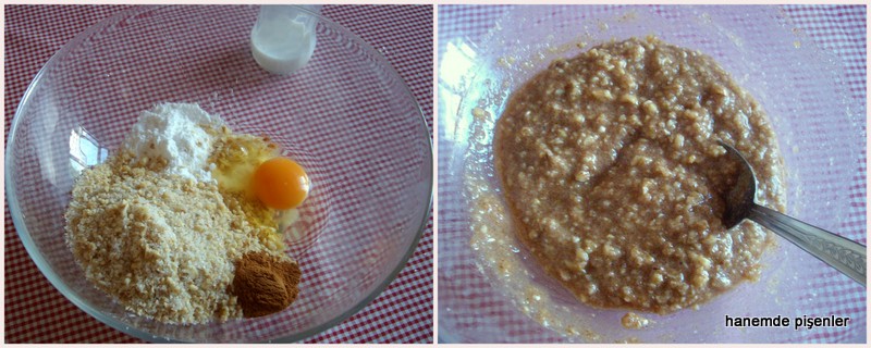 Üzeri yer yer çatalla delinerek (aşırı kabarmasını istemediğimiz için) 180 dereceye ısıtılmış fırında 10 dk pişirilir. Bu arada iç sosu hazırlanır. Dövülmüş ceviz, pudra şekeri, bir yumurta, tarçın ve iki kaşık süt karıştırılır. (Benim pudra şekerim az kalmış, eksik kalan kısmı toz şeker ile tamamladım. Cevizi robotta çekerken içine toz şeker ilave ettim biraz incelsin diye.)