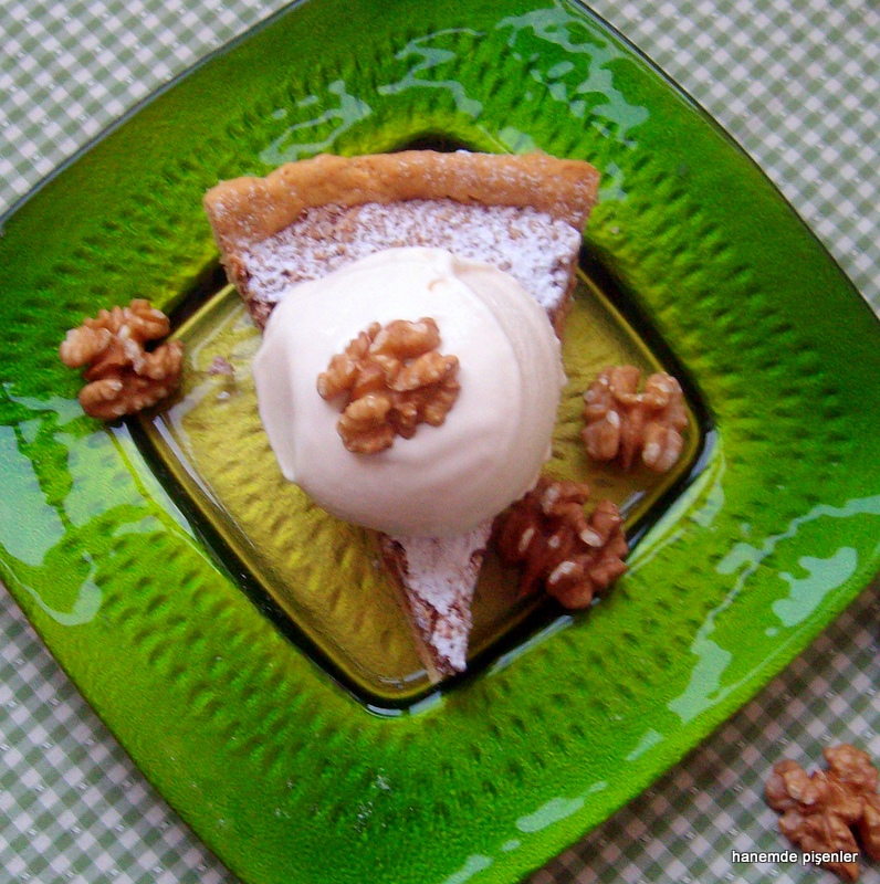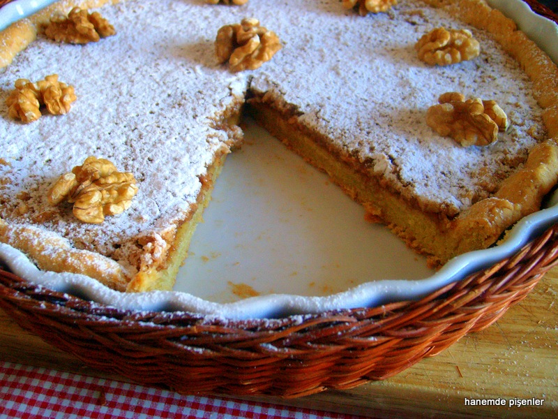 İzmir’den sevgili arkadaşım Arzu’nun denemem için tavsiye ettiği tarifi yapmak için uzun zamandır fırsat kolluyordum. Araya giren çeşitli tariflerden sonra hep aklımın bir kenarında bekleyen tartı dün nihayet yapabildim. Gerçekten çok pratik ve lezzetli bir çay saati tarifi. İç malzemesi Fransız tatlılarında sıkça kullanılan “frangipane” denen sıklıkla ince çekilmiş badem, şeker, tereyağı, yumurta ve çok az un karışımı ile yapılıp tartların ya da milföylerin içine konan bir karışıma benziyor. Bunun ceviz ile hazırlanmışı diyebiliriz. Az bir farkla ki frangipane’de badem çok ince çekilmiş oluyor ve karışımda tereyağı bulunuyor, bizimkinde cevizi ben biraz daha irice bıraktım, pirinç tabir edilen kırıklıkta kaldı. Dilerseniz daha da ince çekilebilir tabi. Ayrıca yağ kullanılmıyor, zaten ceviz yeterince yağlı bir kuru yemiş, yağ koymadan da son derece lezzetli oldu. Bence bu usul diğer kuru yemişlere de uygulanabilir. Fındıkla da çok güzel olacağına eminim, bir tarifte mutlaka kullanmak istiyorum.