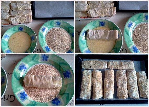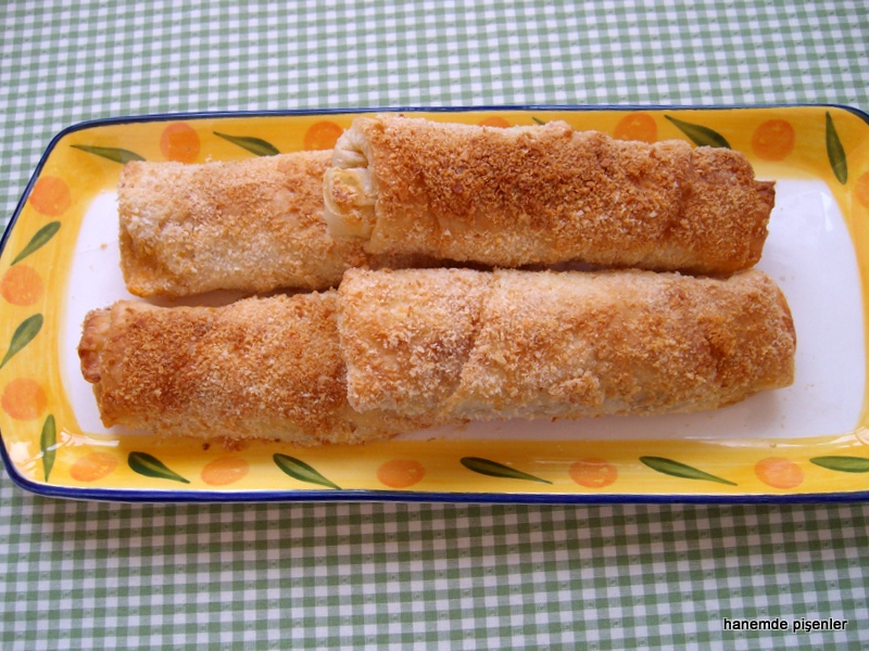 Hazırlanan börekleri önce sosa sonra da kurutulmuş ekmek içine buladım. Tepsiye dizdiğim börekleri 200 dereceye ısıtılmış fırında 30-35 dk arasında kızarana kadar pişirdim.