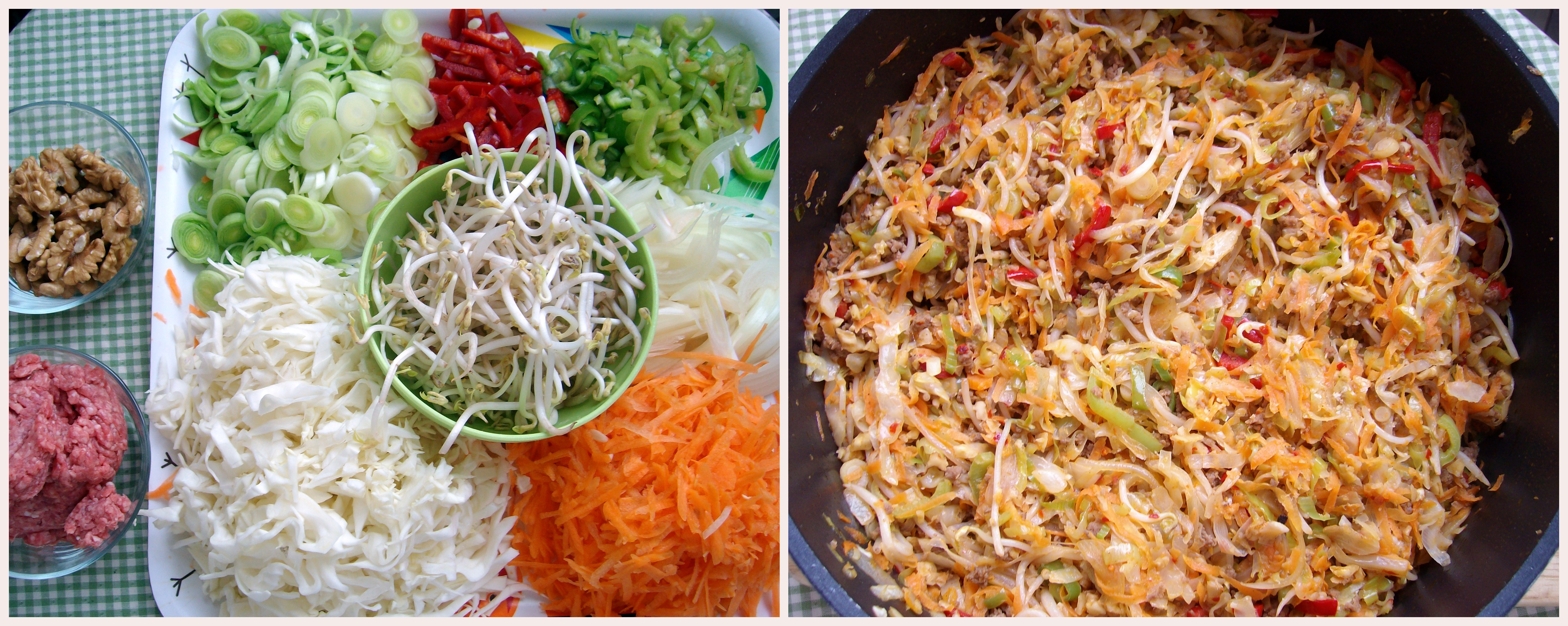 Tüm sebzeleri ince ince kıydım. Bir tencerede çok az zeytinyağı ile kıymayı az pişirdim, sebzeleri sırayla ilave ederek sotelemeye devam ettim. Sebzeler yumuşayıp hafifçe piştiğinde baharatları ve tuzunu ekledim. Cevizi irice kıyıp karışıma ilave ettim, iç harcını soğumaya bıraktım.