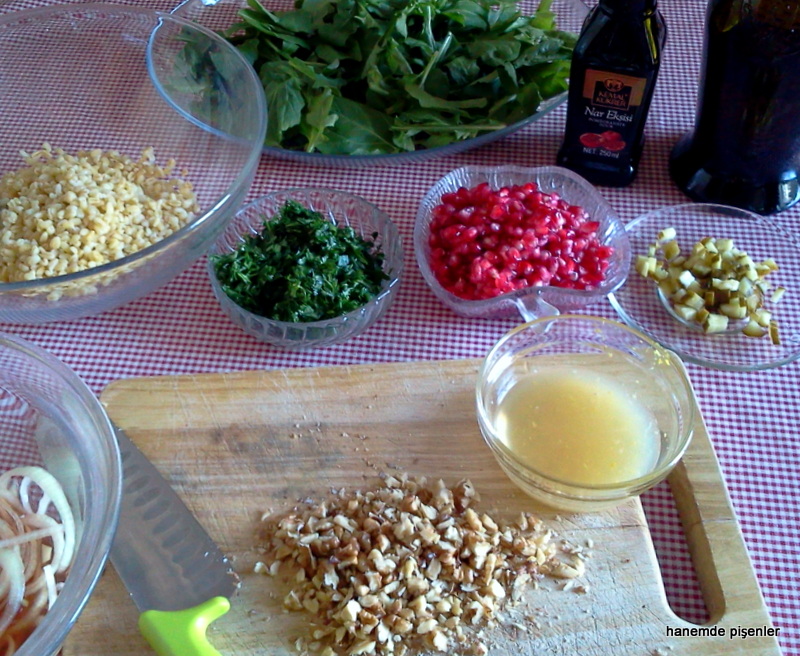 Bir limonu iyice yıkadıktan sonra kabuğunu rendeledim bir kaba koydum. Suyunu sıkıp onu da üzerine ilave ettim. Limon kabuğu aromasının sosa iyice geçmesini istedim. Limon suyuna eşit miktarda zeytinyağı koydum. Tuz ve değirmen karabiber ekledikten sonra iyice çırparak sos kıvamına getirdim. Sosun dörtte birini rokaların üzerine gezdirdim ve elimle harmanladım, servis kabının tabanına yerleştirdim. Kalan sosa nar ekşisi de ilave ederek tekrar çırptım. Nar ekşisi miktarını arzunuza göre ve kullandığınız ürünün tadına göre siz ayarlayabilirsiniz. Salatanın süslemesi için kullanmak üzere nar, ceviz ve kıyılmış yeşilliklerin bir kısmını ayırdım. Kalanları ve tavla zarı büyüklüğünde doğradığım kornişon turşuları haşlanmış bulgurun olduğu kaba koydum, güzelce karıştırdım. Nar ekşili, limonlu sosu üzerine döktüm, harmanladım. Soslanan bulgurlu karışımı rokaların üzerine yaydım.