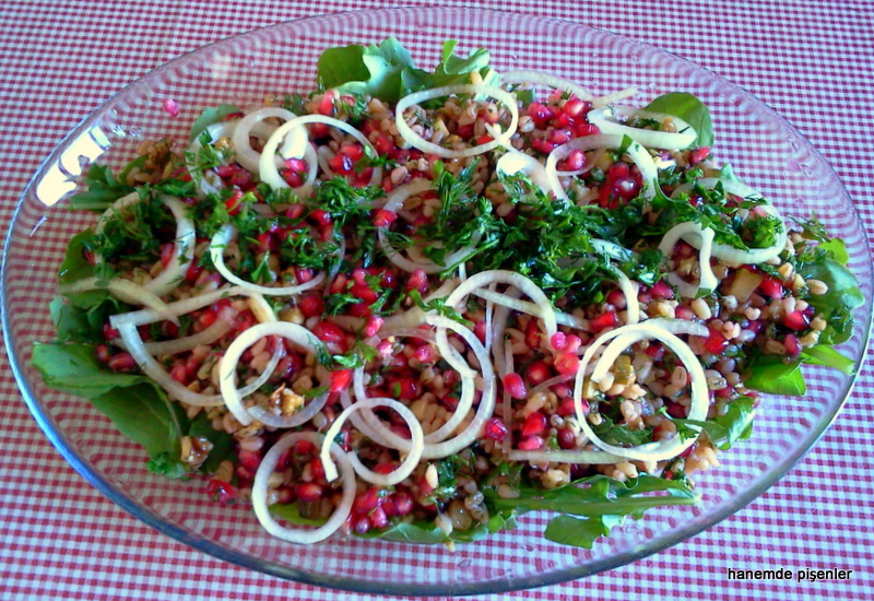 En üste sirkede beklemiş soğan halkalarını serpiştirdim. Sirkede 15-20 dk kadar bekleyen soğanlar sertliğini ve yakıcılığını yitirmiş ama sirkeli lezzeti ile bambaşka bir hale gelmiş oluyorlar. Salataya farklı bir lezzet ve doku katıyorlar. Ayırdığım nar taneleri, ceviz ve kıyılmış yeşilleri de serperek salatamı tamamladım. En son olarak biraz daha nar ekşisi ve zeytinyağı gezdirerek servis yaptım.