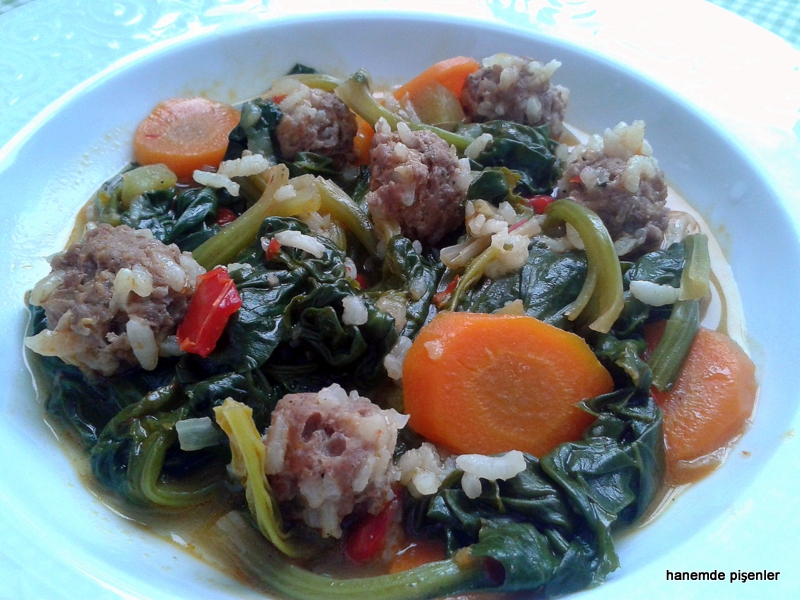 Hep hamur işleri, tatlılar, ağır yemekler yapmıyorum elbette mutfağımda. Gündelik hayatımızda bolca sebze yemeği yer alıyor masamızda. Ispanak da en sevdiğimiz sebzelerden biri. Klasik kıymalı pirinçli ıspanak yemeğine değişik bir alternatif olarak mini köftelisini yaptım geçenlerde. Tarif basit;