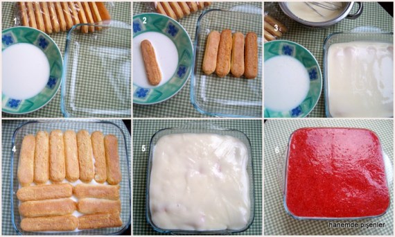 Sos tenceresinde un, nişasta ve şeker harmanlanır. Süt azar azar ilave edilerek topaklanmadan yedirilir. Orta ateşte çırpıcı ile sürekli karıştırılarak muhallebi kıvamına gelene kadar pişirilir. Ocaktan alınan muhallebinin içine tereyağı, limon suyu ve vanilya eklenerek iyice karıştırılır. El mikseri ile çırparak ılınması sağlanır. Bu arada kedi dili bisküvileri süte batırılarak servis kabının dibine bir sıra halinde dizilir. Üzerine muhallebinin yarısı dökülür, düzgünce yayılması sağlanır. Kalan bisküviler süte batırılarak muhallebinin üzerine 2. kat olarak döşenir, üstüne muhallebinin kalanı dökülür.