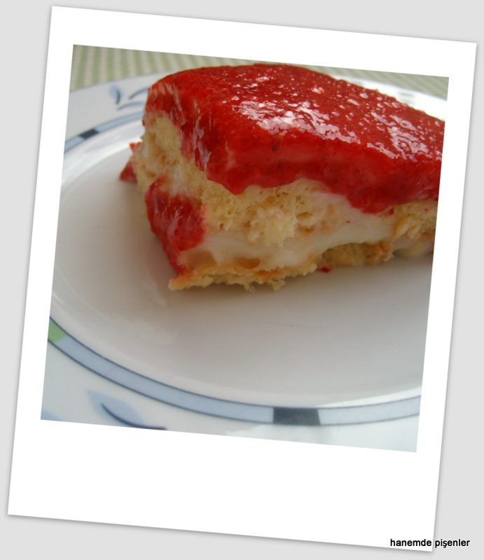 Yılın bu zamanları gelip çilekler tezgahlarda bolca ve lezzetli haliyle yer almaya başladığında içimi mutluluk kaplar. Bence çilek de çikolata gibi mutluluk veren gıdalardan biri kesinlikle. İyi ve olgun bir çileği ısırırken burnuma dolan lezzetli kokusu çok hoştur. Eski çilekler yok artık desek de son bir kaç yıldır lezzetli çilekler bulabilir olduk mevsiminde. Her sebze ve meyvede olduğu gibi çilek de mevsiminde güzel. Çilekler bollaştığında reçel yapma zamanı gelene kadar her tatlıda her meyve ikramımda çilek kullanmak isterim. Bu tatlı da sık sık yaptığım lezzetli ve kolay bir tarif. Can dostum Özlem’in yıllar önce bana vermiş olduğu bir reçete. Elbette profesyonel bir tatlı değil, ev hanımlarının birbirlerine verdiği hafif , kolay bulunan malzemelerle yapılan bir tarif. İkimiz de hala kullanıyoruz.