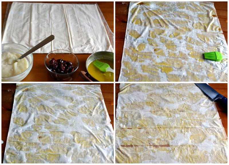 Her bir bezeyi merdane yardımıyla çay fincanı tabağı boyutunda açın. Her bir bezenin üzerine eritilmiş tereyağından bolca sürün. Mermer mutfak tezgahı üzerinde ilk bezeyi hafifçe elinizle esneterek büyütün. Yağlanmış hamurlar elle kolayca esnetilebiliyor merak etmeyin. Diğer bezeyi ilk esnettiğinizin üzerine ortaya koyun. Kenarlarından alttakinin büyüklüğüne göre esnetin. Diğer bezelere de aynı işlemleri yaparak ilk altı tanesini üst üste koyun ve kullanacağınız tepsi genişliğinde esnetin. Yağlanmış tepsiye kenarları hafif taşacak şekilde yerleştirin. Diğer altı bezeye de aynı işlemleri yaparak üst katı hazırlayın. Hazırladığınız kıymalı harcı alt katın üstüne yayın. İkinci hamuru harcın üstüne yayın, alttan sarkan hamurla üst katı birbirine yapıştırarak kenarları kapatın. En üste de biraz tereyağı gezdirdikten sonra 220 derece ısınmış fırına verin. Sürekli gözleyerek altın kırmızısı haline gelene kadar pişirin (yaklaşık 30 dk)