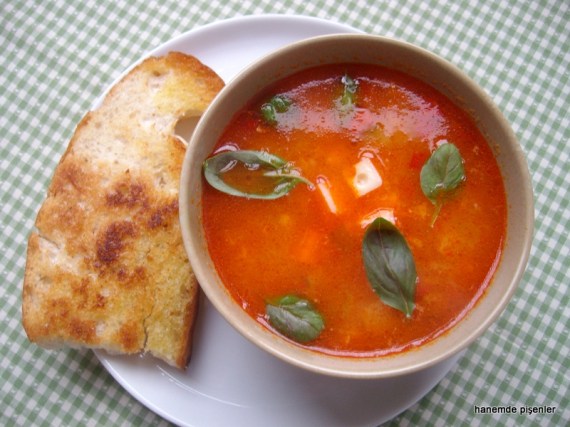 Öncelikle bütün sebzeleri tavla zarı büyüklüğünde doğradım. Tencereye zeytinyağını koydum, soğanları ilave ettim. Hafifçe soğanlar piştikten sonra sarımsakları ilave ettim. Ardından sırasıyla bir kaç dakika aralıklarla kırmızı biberleri, kerevizleri, kabakları ve patetesleri ekledim ve soteledim. Sebzeler sotelendikten sonra domates püresini ekledim. Biraz piştikten sonra tavuk suyunu ve suyu koydum. Tuzunu, karabiberini ve defneyi ilave edip kaynamaya bıraktım. Haşlanmış kuru fasulyeler de eklendikten sonra bir süre birlikte piştiler. En son bir tutam erişteyi ilave edip 10 dk daha kısık ateşte kaynatıp altını kapattım. Servis yaparken domates çorbasında yaptığımız gibi peynir eklemek istedim. Evde bulunan tuzlu ve kolay erimeyen manyas peynirini tavla zarı boyutunda kestim ve çorbanın üstüne koydum. Son dokunuş olarak da fesleğen yaprakları ekledim. Yanında sarımsaklı ekmek de çok uyumlu oldu kendi adıma söylersem. Çorbayı içerken yumuşamış ama erimemiş peynir parçaları ağıza hoş bir tat verdi. Kıbrısta da sanırım hellim peyniri kızartılarak çorbalara ilave ediliyor. Bu da farklı bir alternatif, aklınızda bulunsun.