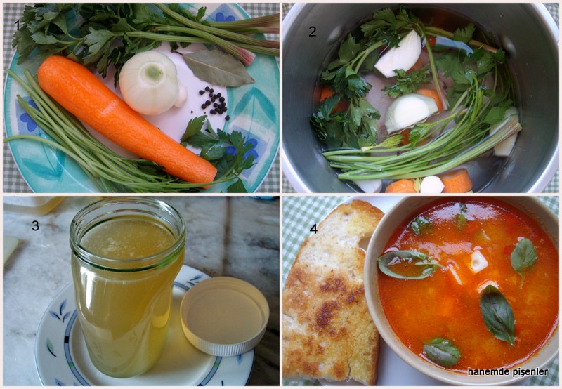 Tavuk ve kemik suyu hazırlamak konusunda ayrı bir yazı hazırlamak istiyorum aslında. Mutfakta boş bir zamanımızda hazırlayıp buzluğa kaldırabileceğimiz lezzetli et ve sebze suları yemeklerimizin tadına tad katıyor. Kısaca burada kullandığım tavuk suyundan bahsedersem; temel lezzet verici sebzeler olan soğan, kereviz sapları, havuç, maydanoz sapları, defne, karabiber taneleri ve bir diş sarımsak kullandım tavukla parçalarıyla beraber. Üzerine eklediğim suya tuz da ilave edip önce hızlı ateşte kaynayana kadar bekleyip üzerinde biriken köpükleri aldım. Sonra son derece kısık ateşte bir saat kadar pişirdim. Aslında bu süreyi daha da uzun tutmak mümkün. Böylece daha konsantre bir lezzet elde etmek mümkün bulyonlar yerine kullanılabilecek. Soğuduktan sonra süzüp bir kaç ayrı kaba doldurup buzdolabına koydum. İyice soğuduğunda üzerinde donmuş olan yağını alıp attım ve buzluğa kaldırdım ihtiyaç olduğunda kullanmak üzere. Fakat buzluğa kaldırmayacaksanız üzerindeki yağı almayın diyor uzmanlar. Beklerken bozulmaktan koruyucu bir tabaka görevi görüyormuş. Kullanacağınız zaman bu tabakayı sıyırıp atabilirsiniz. Tavuk yada et suyu hazırlamanın yollarından sadece bir şekli bu anlattığım. Daha farklı uygulamalar da var elbette. Ve tabiki hepinizin yıllardır bildiği uyguladığı bişey yeni değil ama ne olur ne olmaz belki ihtiyacı olan biri vardır diye anlatmak istedim:)